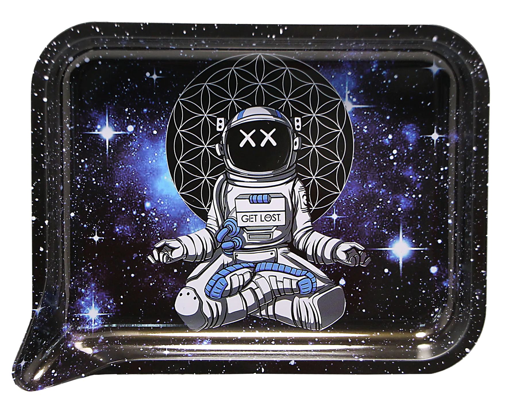 The Get Lost Medium Funnel Rolling Tray - Astronaut Meditating features a secure 3D magnetic lid and built-in funnel edge, designed to combine functionality, durability, and visual appeal. This medium-sized tray offers a practical solution for organizing and handling small materials, with raised edges and a smooth, wipe-clean surface for easy maintenance. Its high-quality construction and compact dimensions make it suitable for home, travel, or retail display.